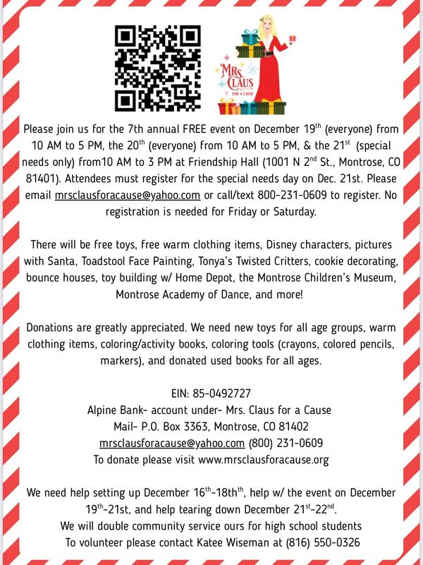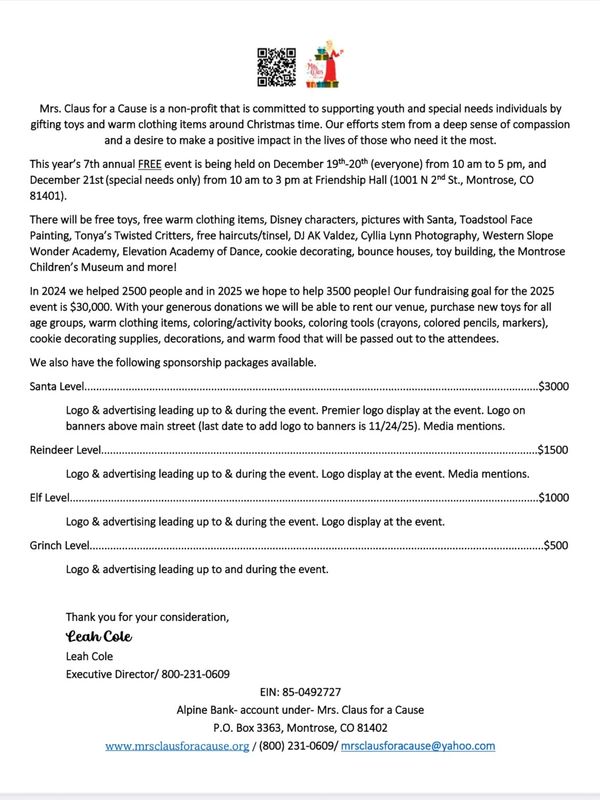 800-231-0609 OR 619-987-2617 mrsclausforacause@yahoo.com EIN: 85-0492727